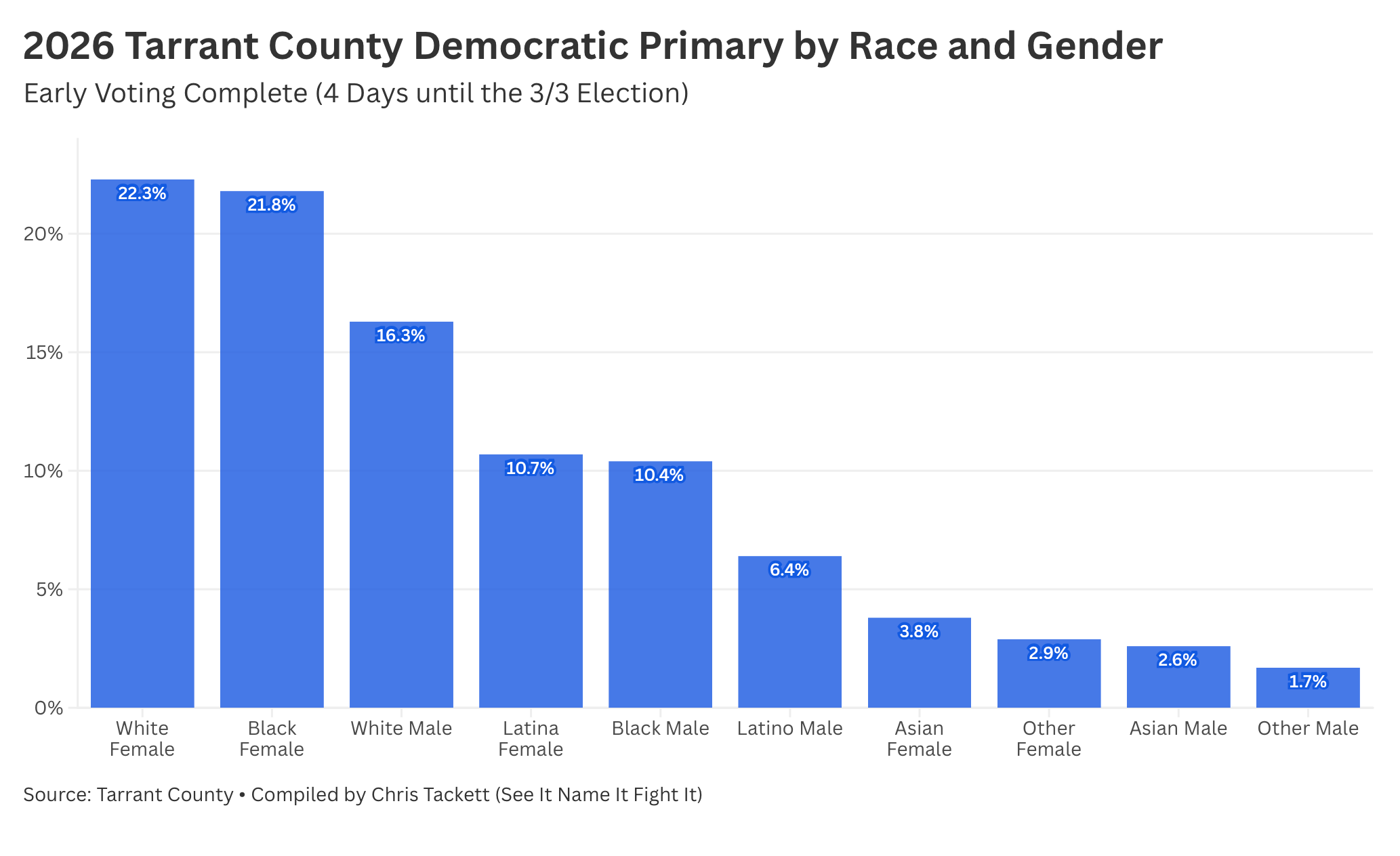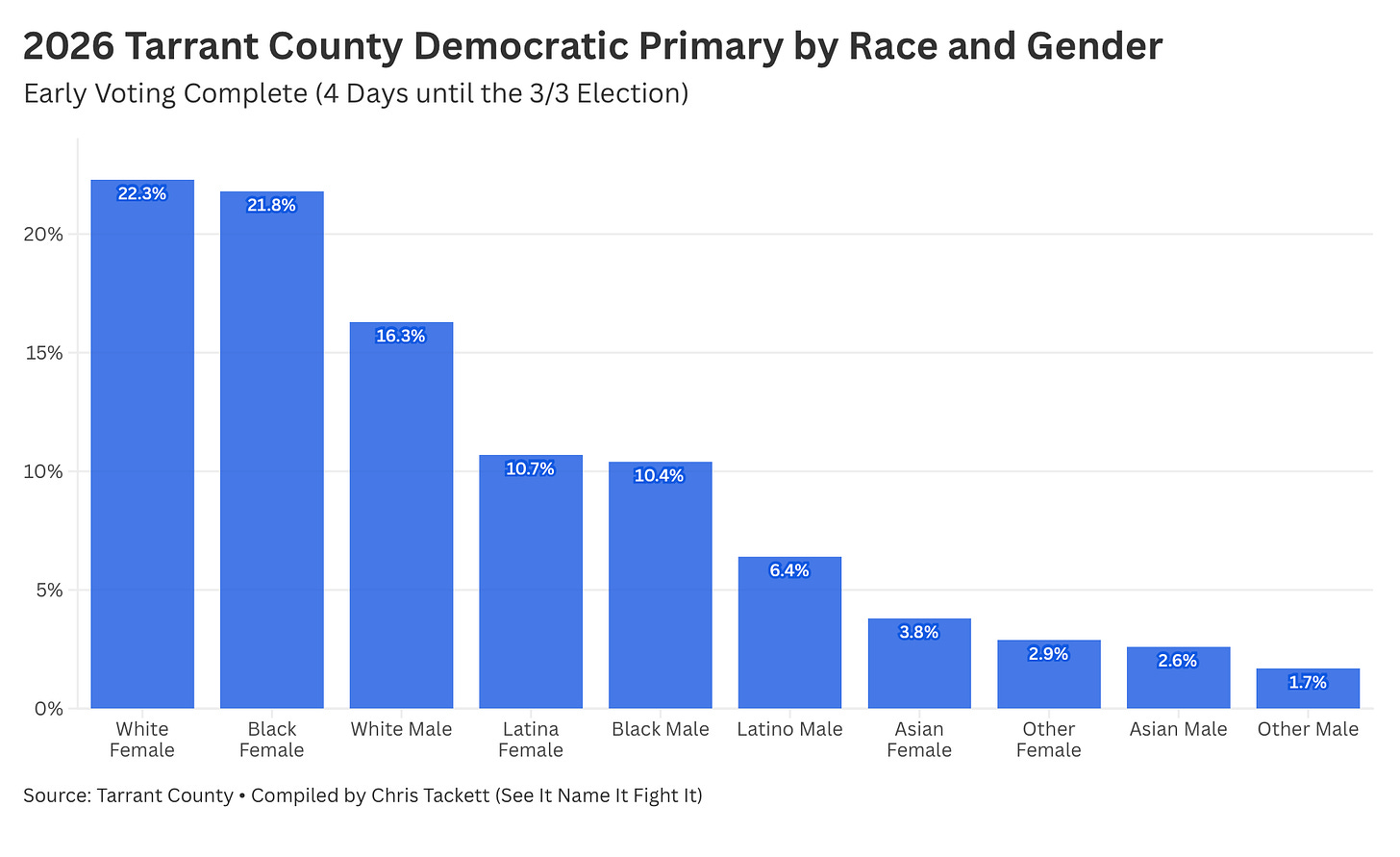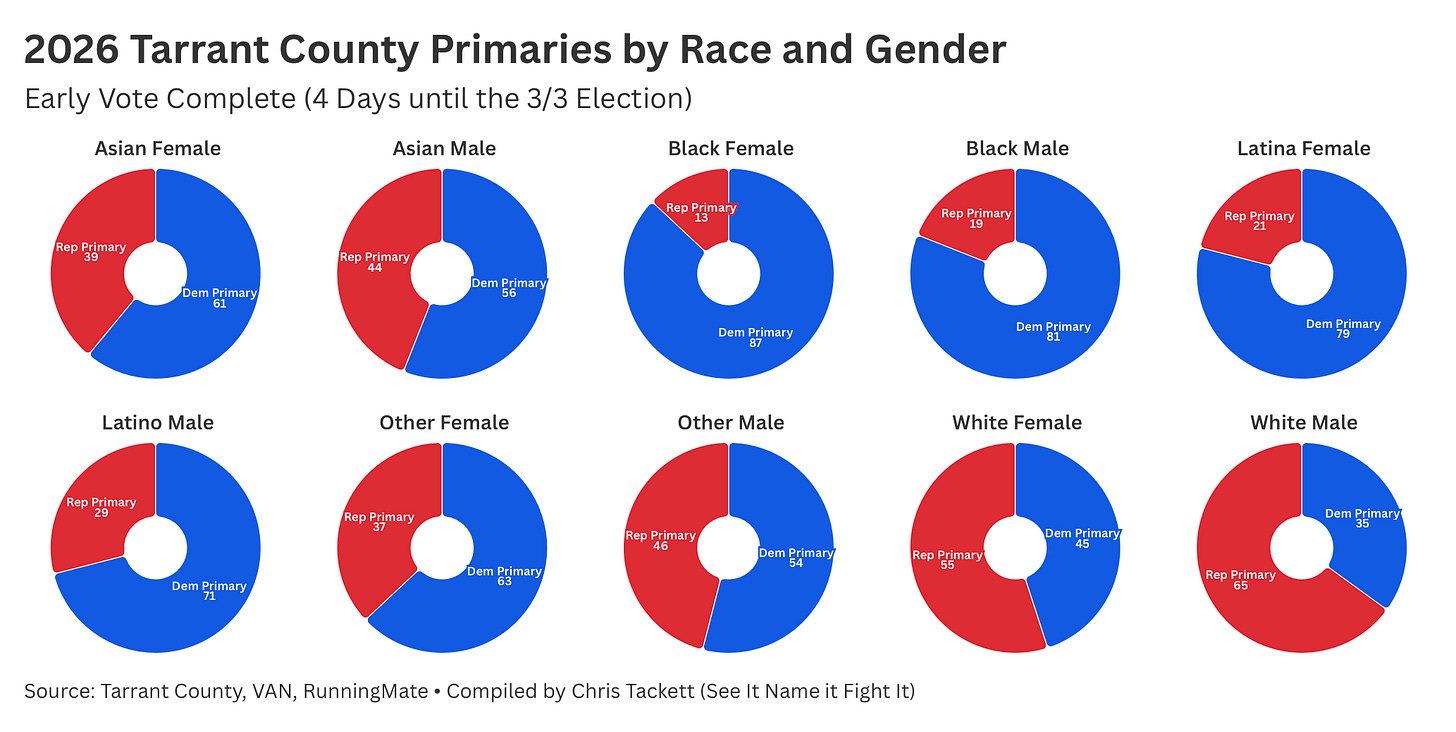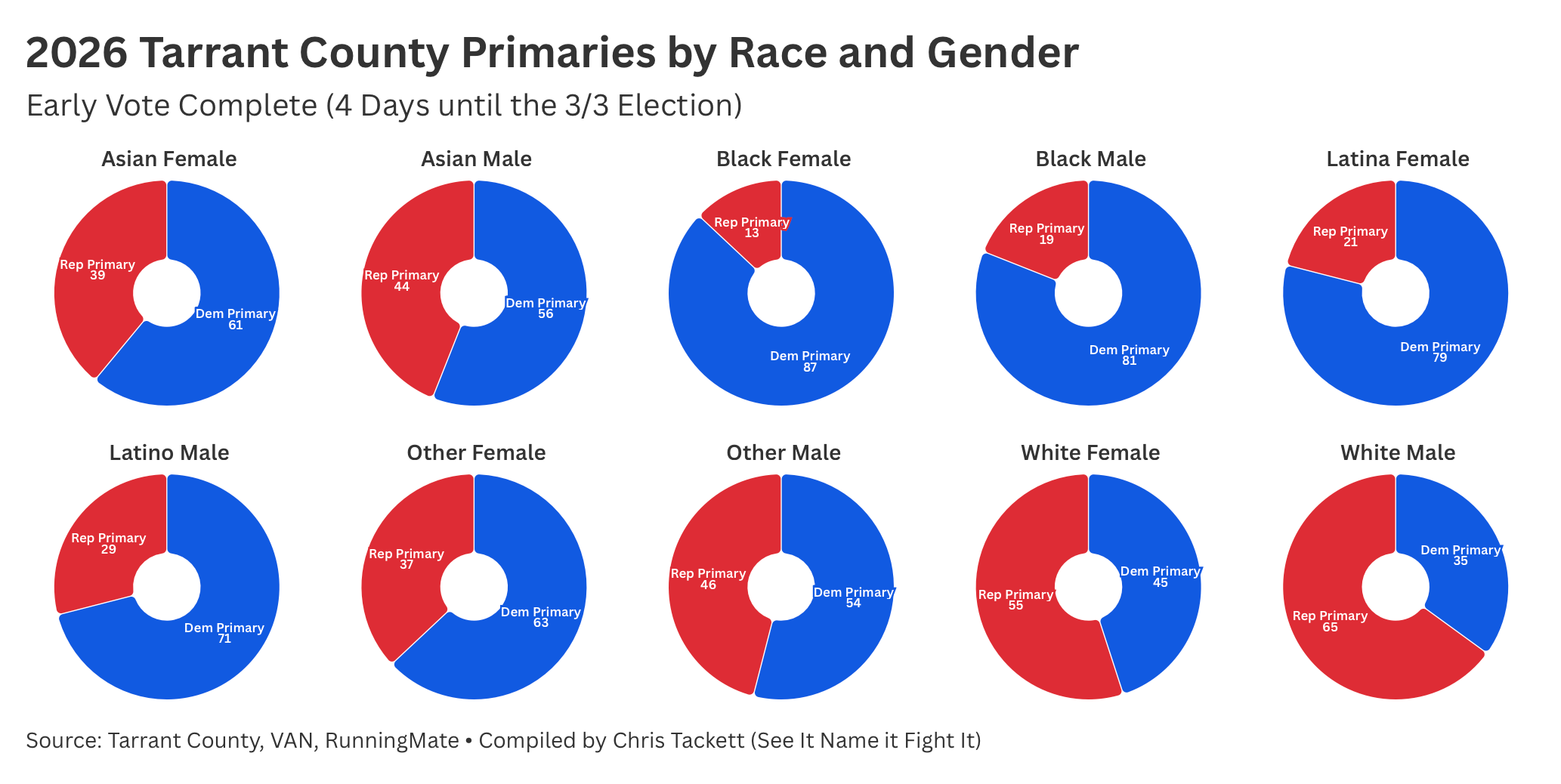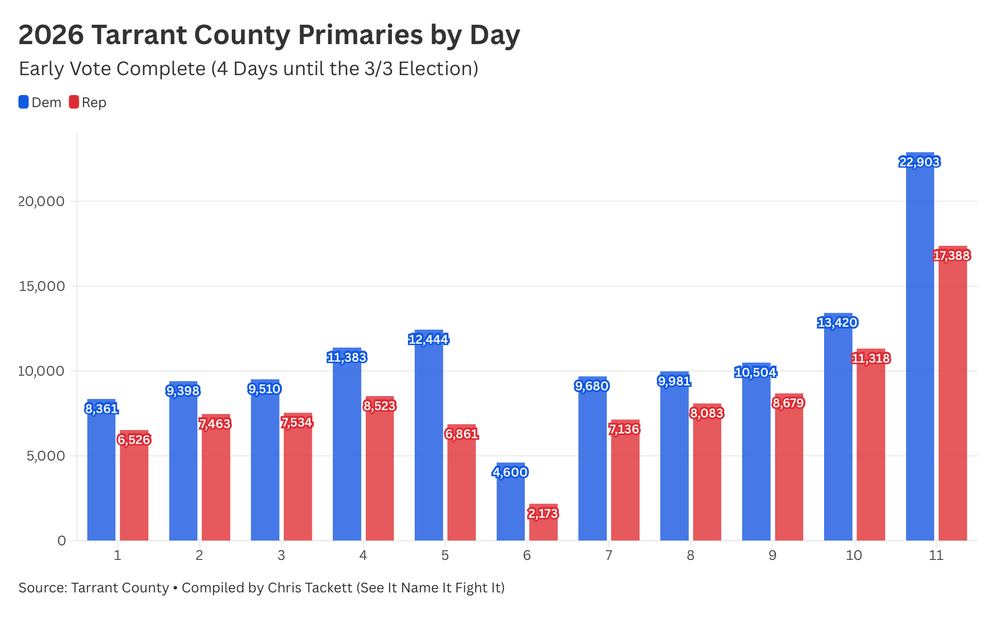 For now, the early vote is done. The data is clear. Democrats turned out in historic numbers in Tarrant County, and the trend held across eleven days and across the state. That is what happened. What it means for March 3rd and beyond, we are gonna know soon enough.