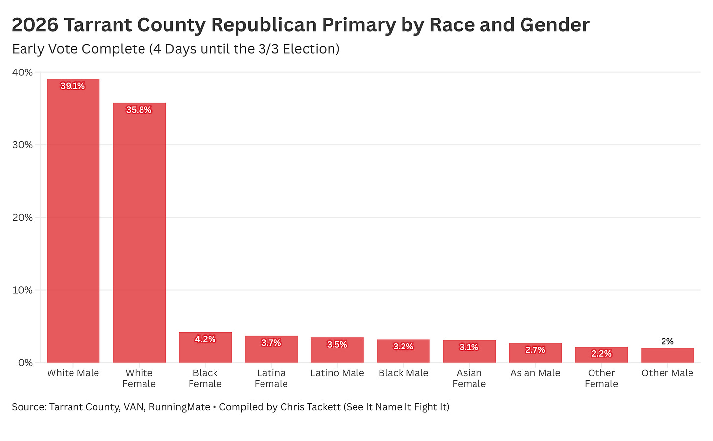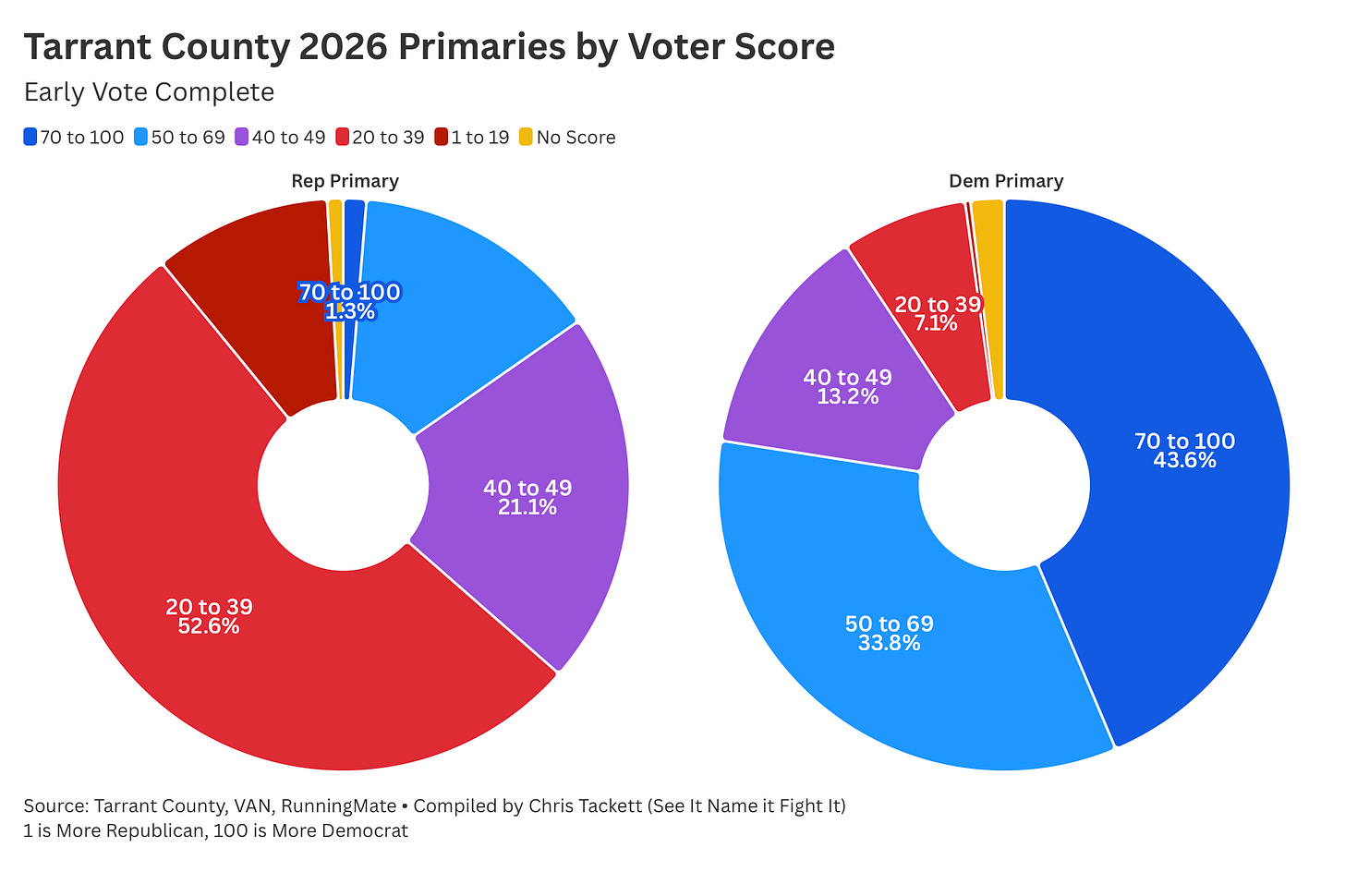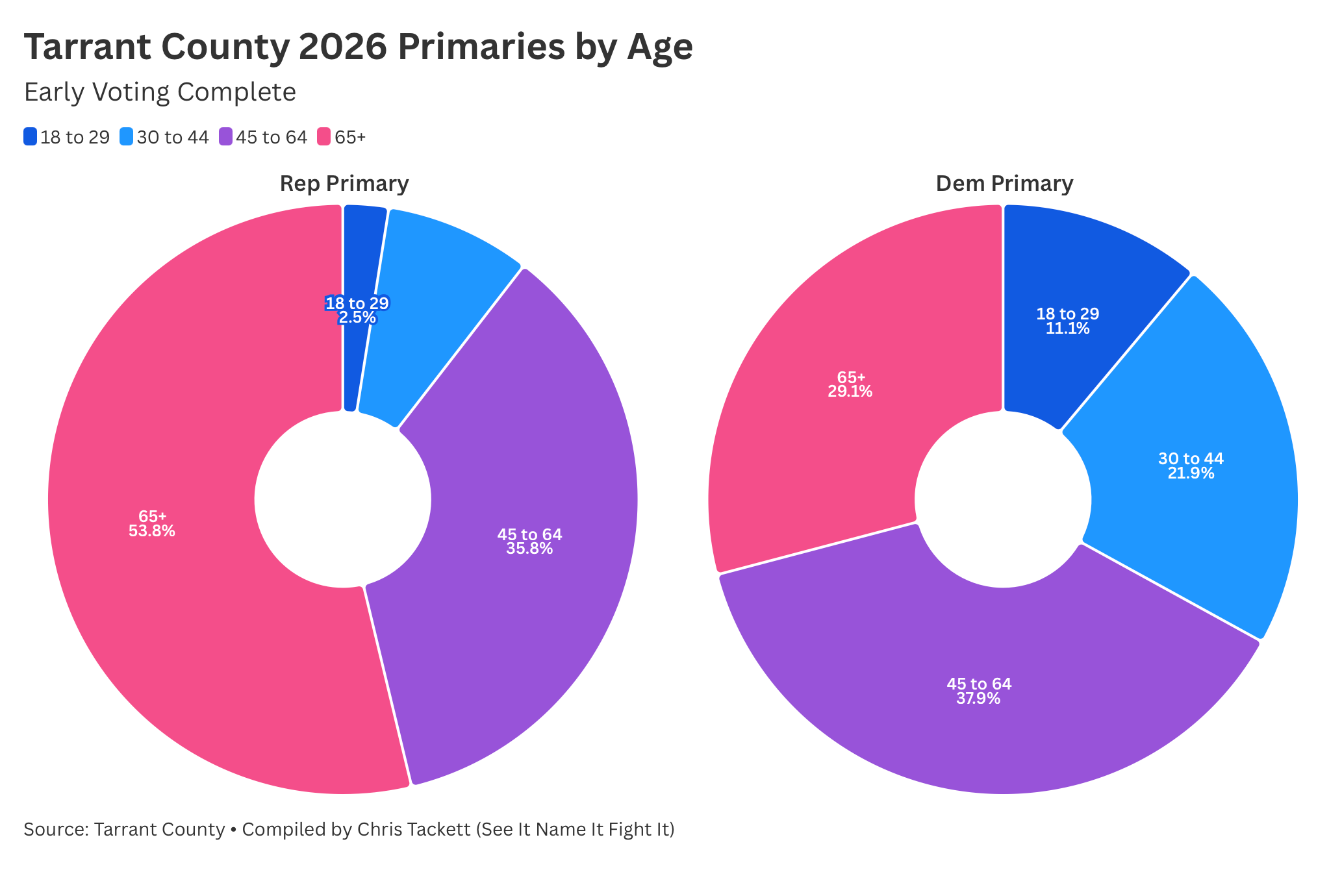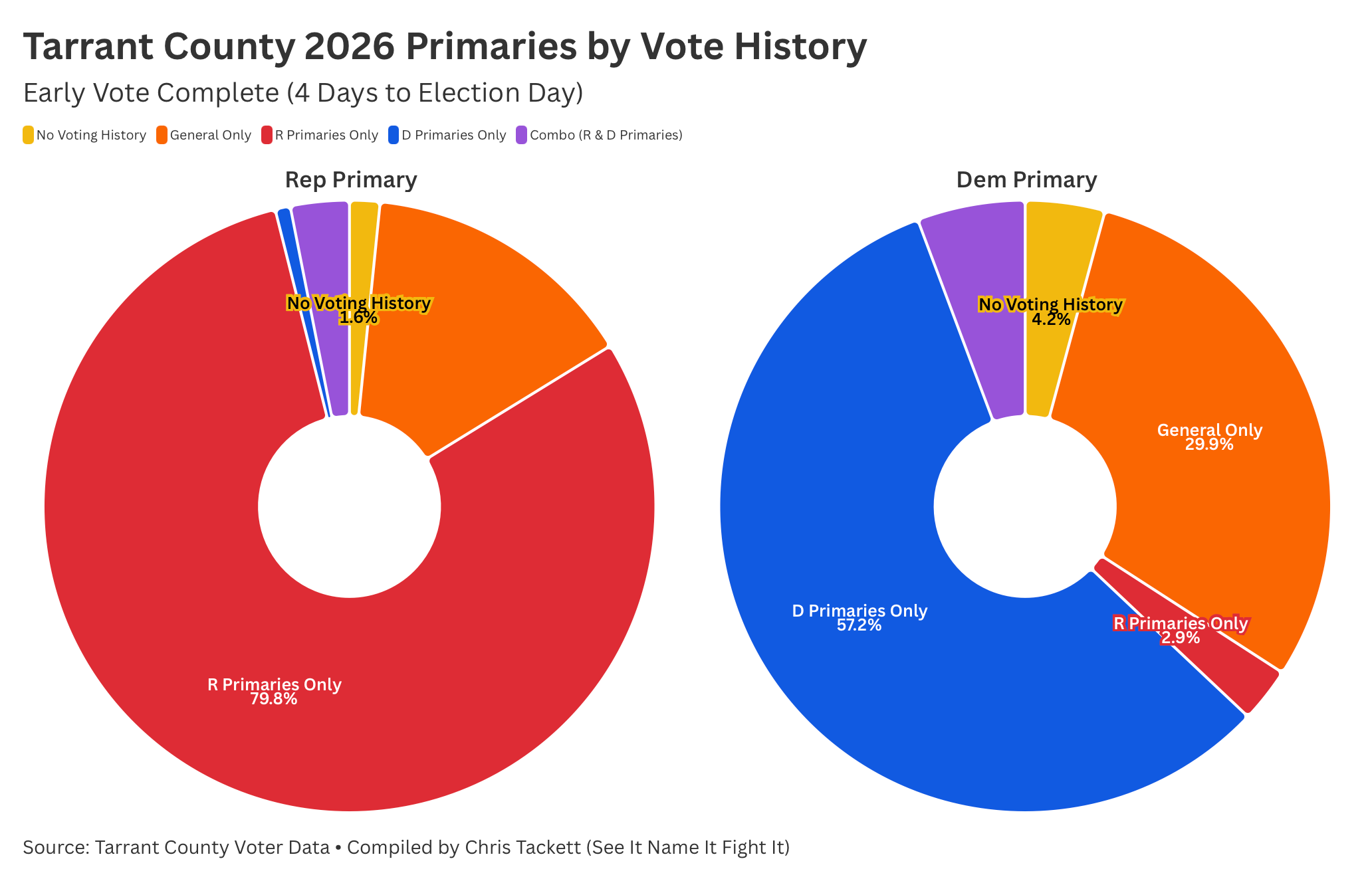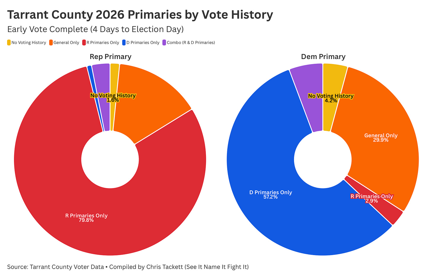 Early voting in Tarrant County’s 2026 primary is done. Eleven days. The ballots are cast, the data is in, and the picture is clear. This is the full accounting of the Early Vote (with Election Day still to come).