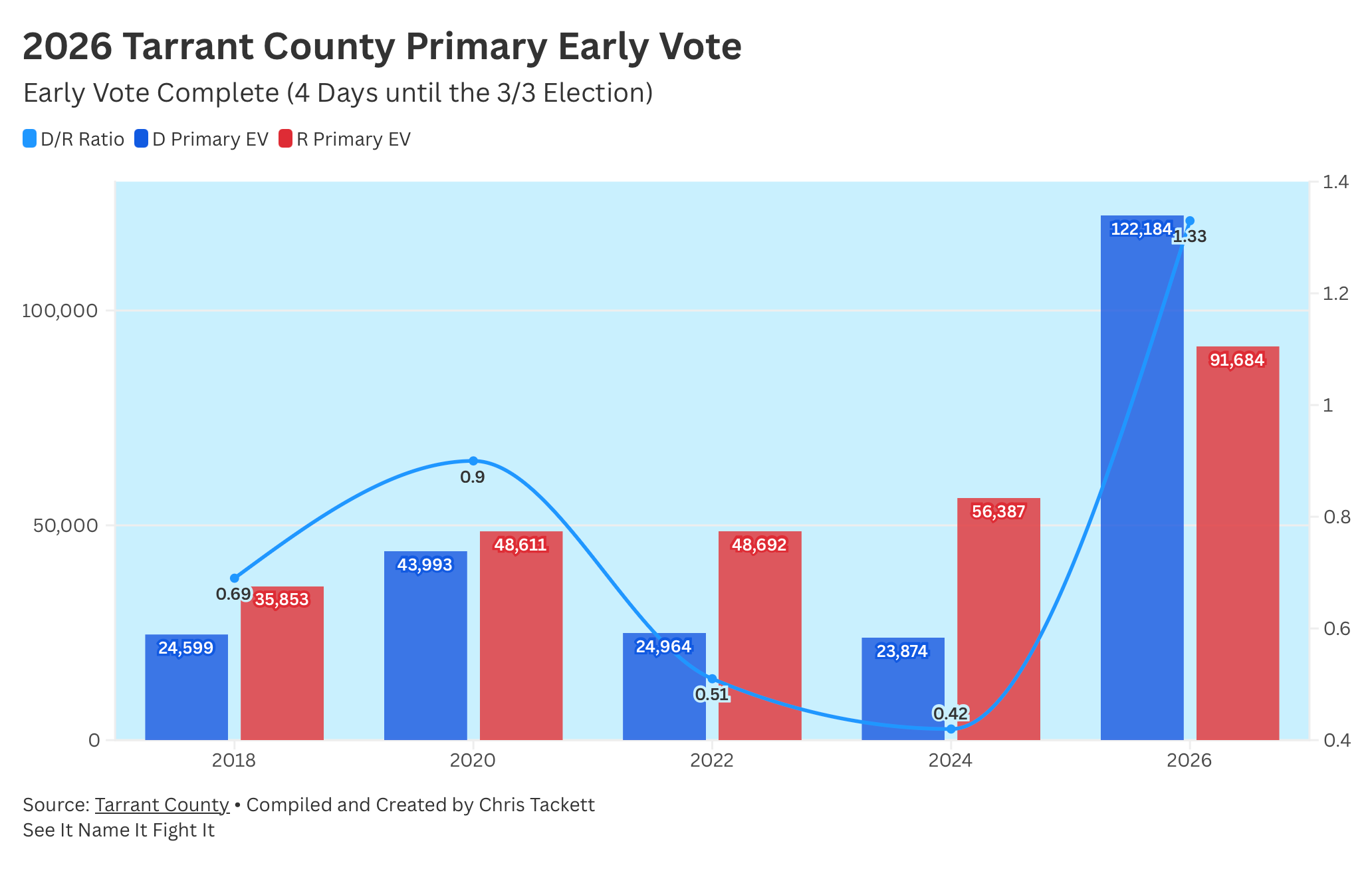 Democrats cast 122,184 early ballots in the Tarrant County primary. Republicans cast 91,684. The final D/R ratio landed at 1.33.