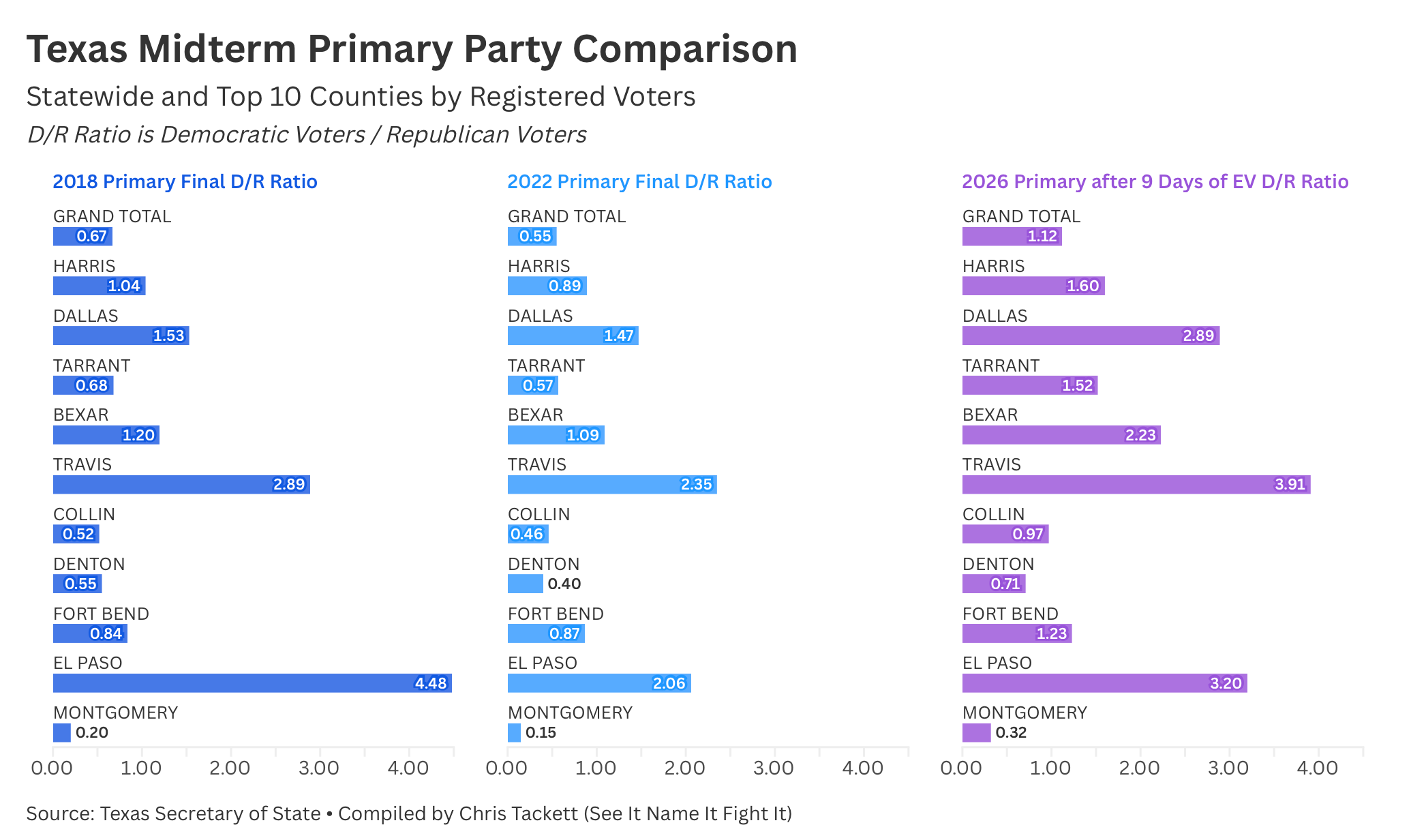 The statewide D/R ratio through nine days sits at 1.12, compared to 0.55 for the full 2022 primary and 0.67 for all of 2018. Dallas County is at 2.89. Harris at 1.60. Bexar at 2.23. Travis at 3.91. Even Collin County, as reliably Republican a suburb as exists in the state, is sitting at 0.97, effectively even between the two parties. Denton is at 0.71, nearly double its 2022 number. Fort Bend at 1.23. Montgomery County remains deep red at 0.32, but even that is more than double its 2022 figure of 0.15.