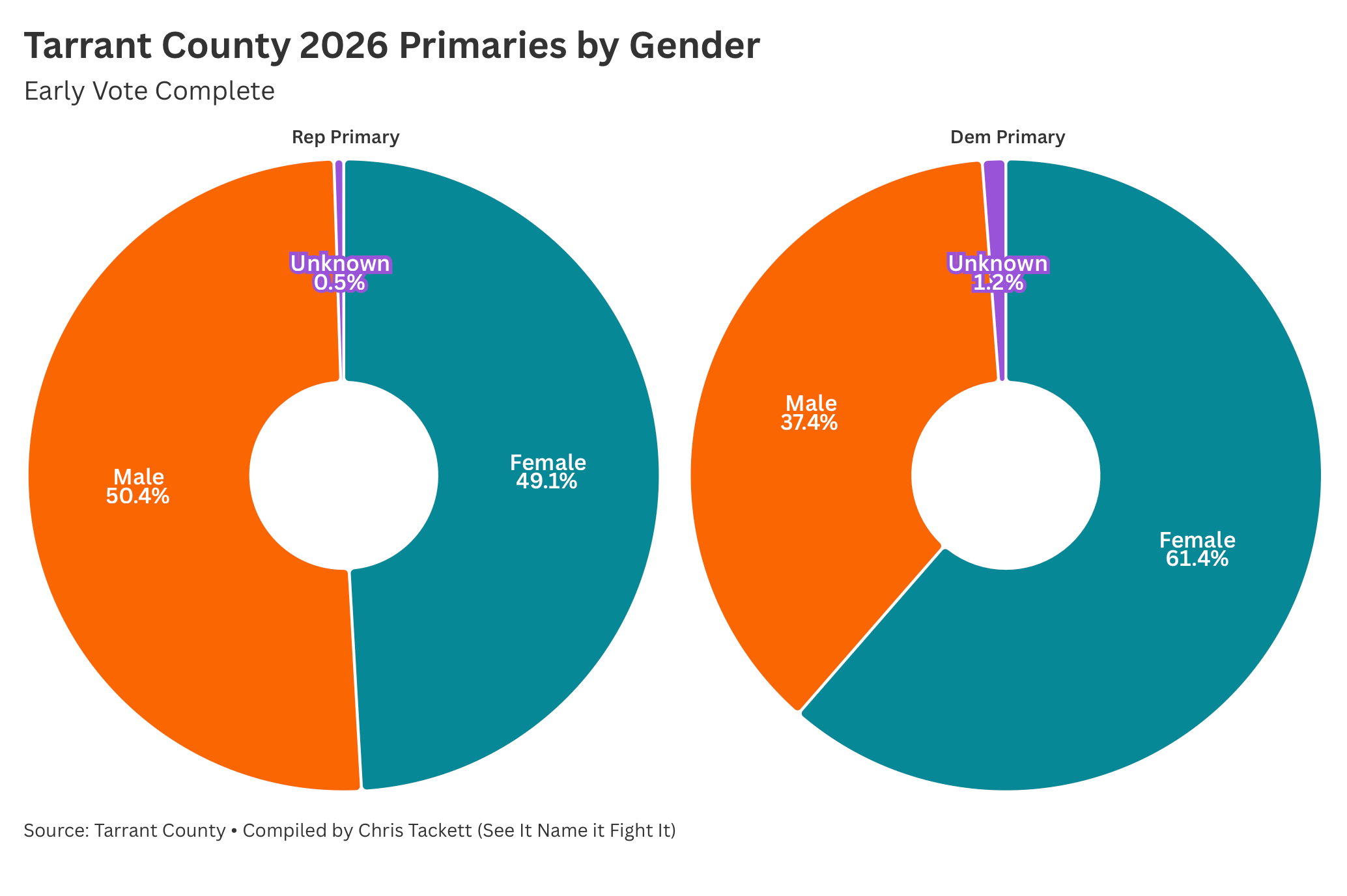 That is not a small gap. That is a 24-point gender split. Democratic primary turnout in Tarrant County this cycle is, in a meaningful and measurable way, being powered by women. In a political environment where reproductive rights, healthcare, and education have dominated the conversation, that number is not surprising. But seeing it this clearly in the data is striking.