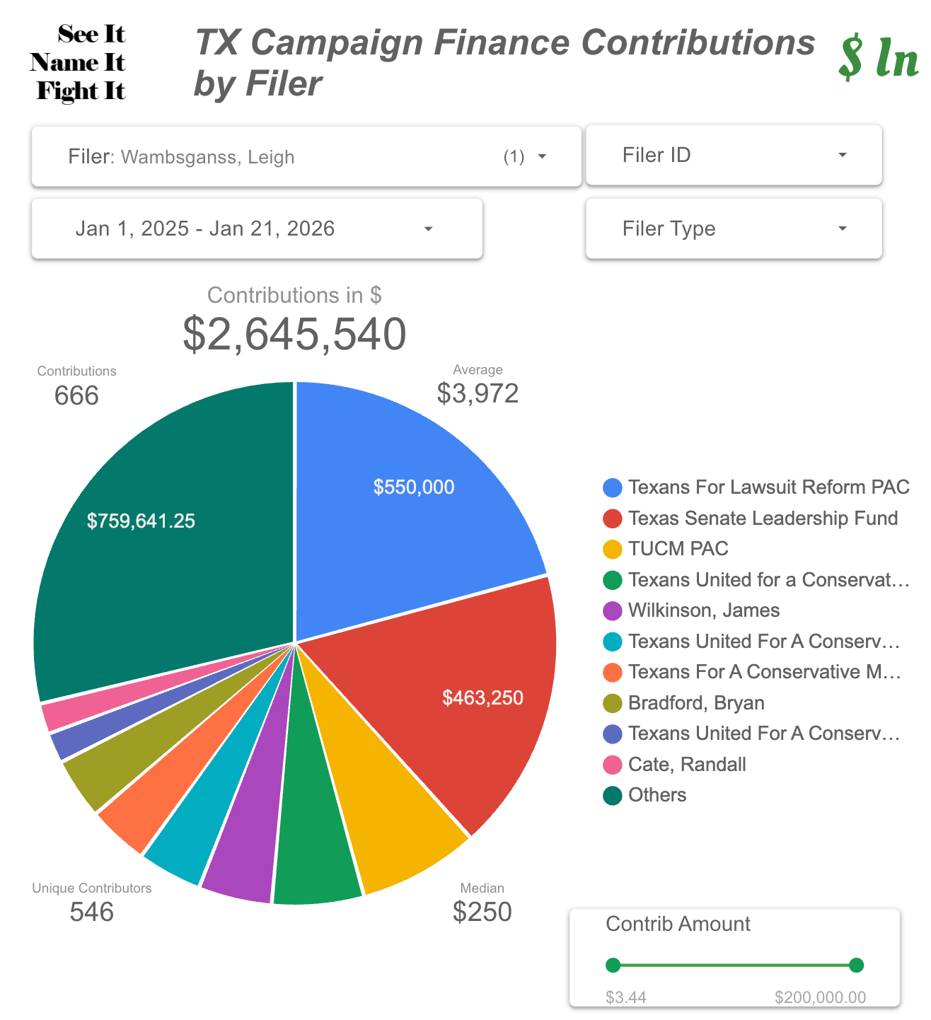 As we now have access to the last campaign finance report we will get on Leigh Wambsganss before Election Day on 1/31, let me run you through a few numbers on the full course of the campaign to help you understand how badly a few billionaires want to own Texas Senators. (Texas Senate District 9)